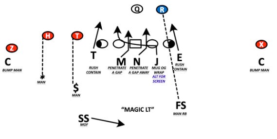 Here’s an example of exchanging the Sting pressure to the interior linebacker against a Trips open set.